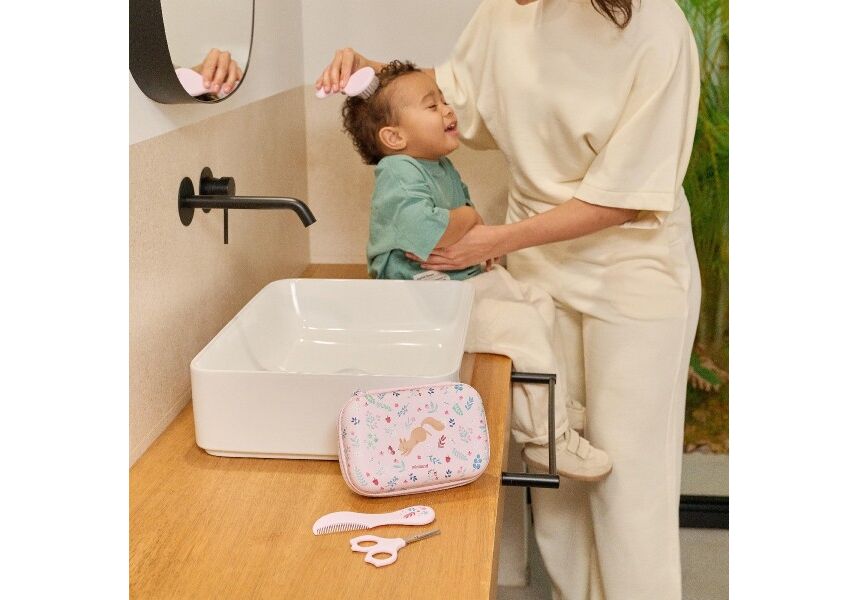 Τα αξεσουάρ του Baby Kit Squirrel είναι ειδικά σχεδιασμένα για το ευαίσθητο δέρμα του μωρού. Το ψαλιδάκι και ο νυχοκόπτης με στρογγυλεμένες άκρες επιτρέπουν ασφαλή χρήση, ενώ η μαλακή βούρτσα και η χτένα περιποιούνται απαλά το τριχωτό της κεφαλής και τα μαλλιά.