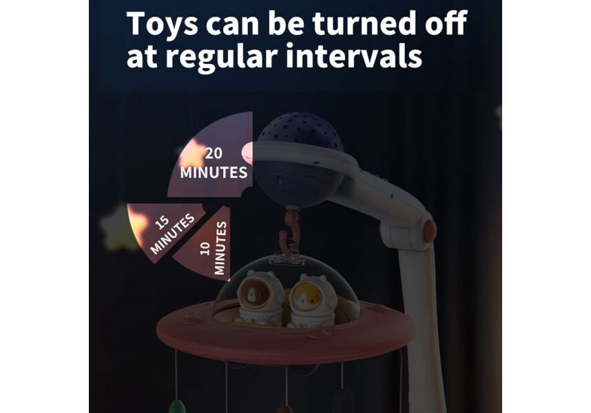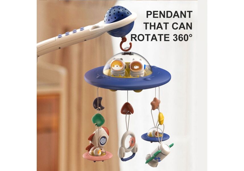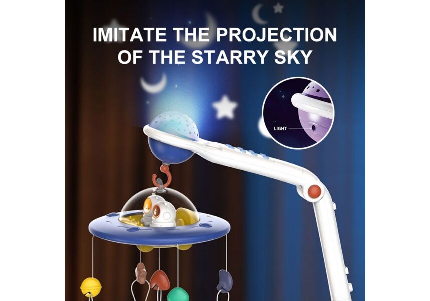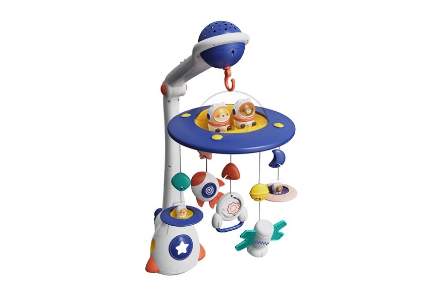 Όλη η μαγεία του νυχτερινού ουρανού μεταφέρεται στο δωμάτιο του μωρού σας, με τον μουσικό προτζέκτορα Spaceship.Οι λευκοί ήχοι και προσομοίωση του νυχτερινού ουρανού θα βοηθήσουν το μωρό σας να χαλαρώσει και να έχει τους πιο γλυκούς και ξεκούραστους ύπνους .Επιπλέον τα παιχνίδια του μπορούν να χρησιμοποιηθούν ως κουδουνίστρες και μασητικά καθώς είναι κατασκευασμένα από ασφαλή υλικά .